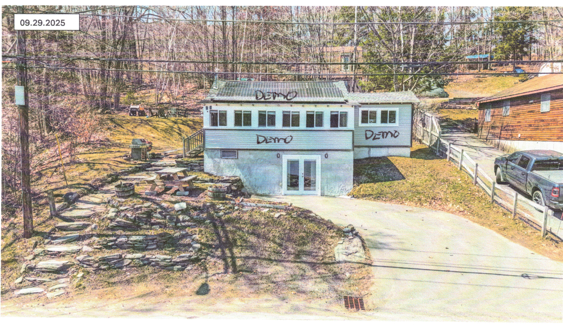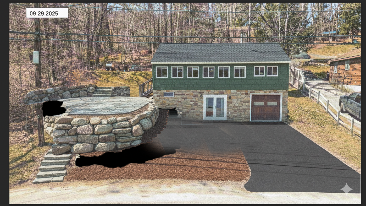 Before & After. Just a note though, we’re doing Redi-Rock steps to the road & driveway and it wont' be boulders. Patio will go back to the hill with steps up to the upper hill. Roof will have 32 solar panels on the front and those front windows will be taller and larger and fenced in yard.
