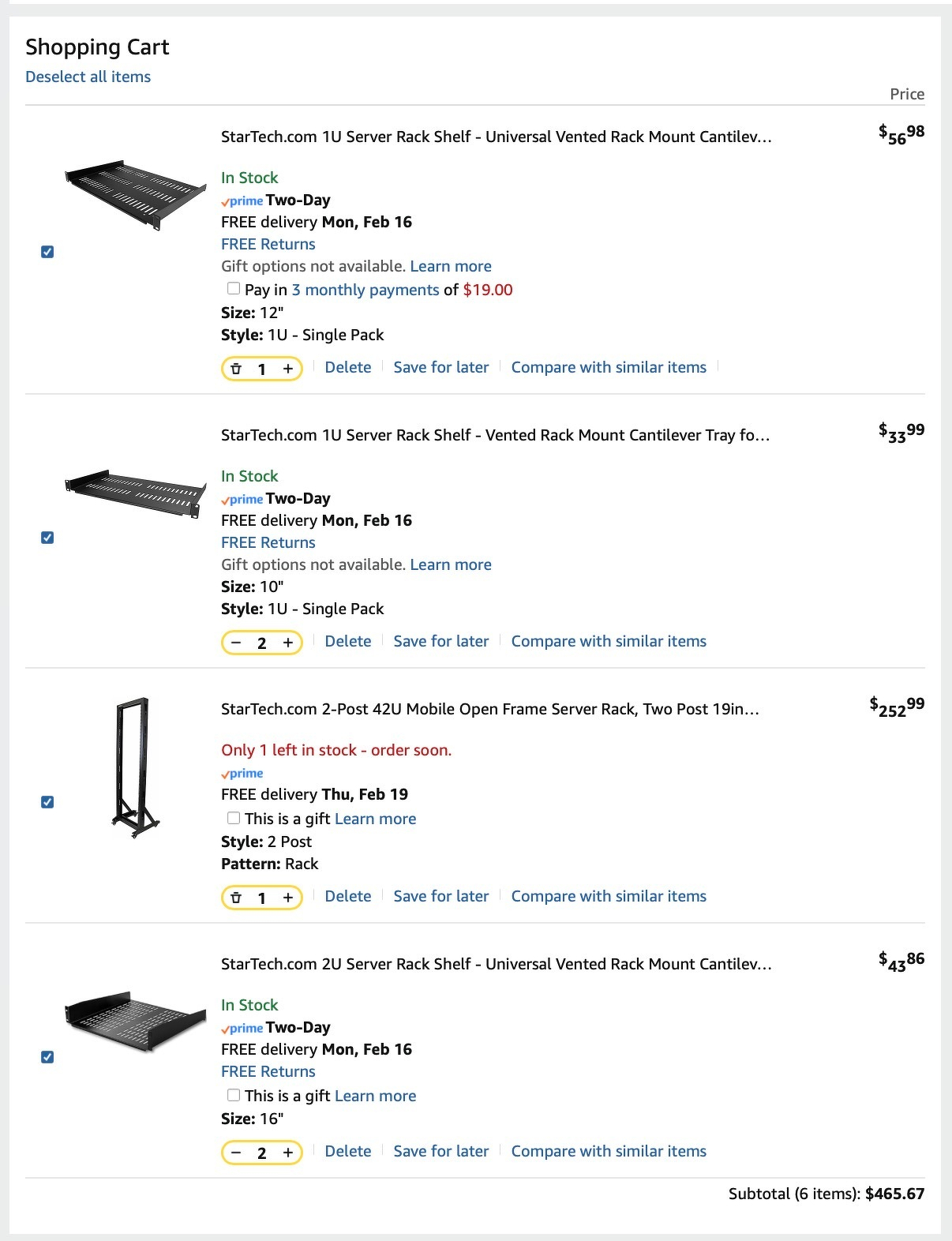 Bought all of these today from a guy on Craigslist for $125. Nice haul. Moving from a 15U rack to a 42U rack. Same depth but we’re going to move AV equipment to sit under the networking equipment after the remodel.